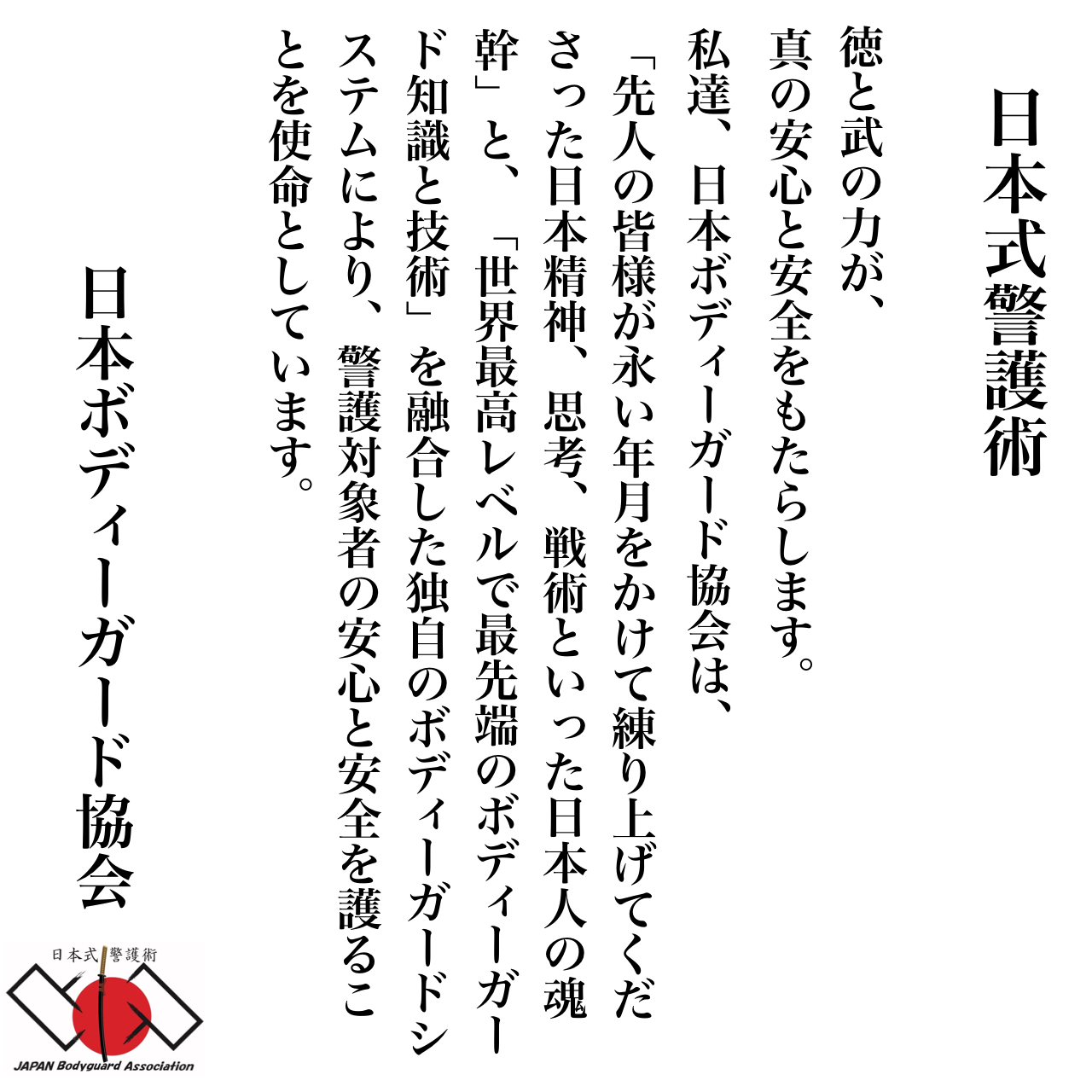 | 目的 | 古の日本人が練り上げた武士道精神を根幹に、日本式の危機管理構築と社会の安心と安全の継続に尽力し貢献することを目的とし、国内の危機管理とボディーガード業務に携わる個人や企業の皆様の危機管理とボディーガードについての研修や雇用などの情報共通の場として、国内外の危機管理とボディーガードについてのネットワーク確立と危機管理とボディーガード業界の発展と技術向上、また日本人警護要員育成の為に先人が培ってきた日本人としての精神や思考を伝えていくことを目的としております。 |